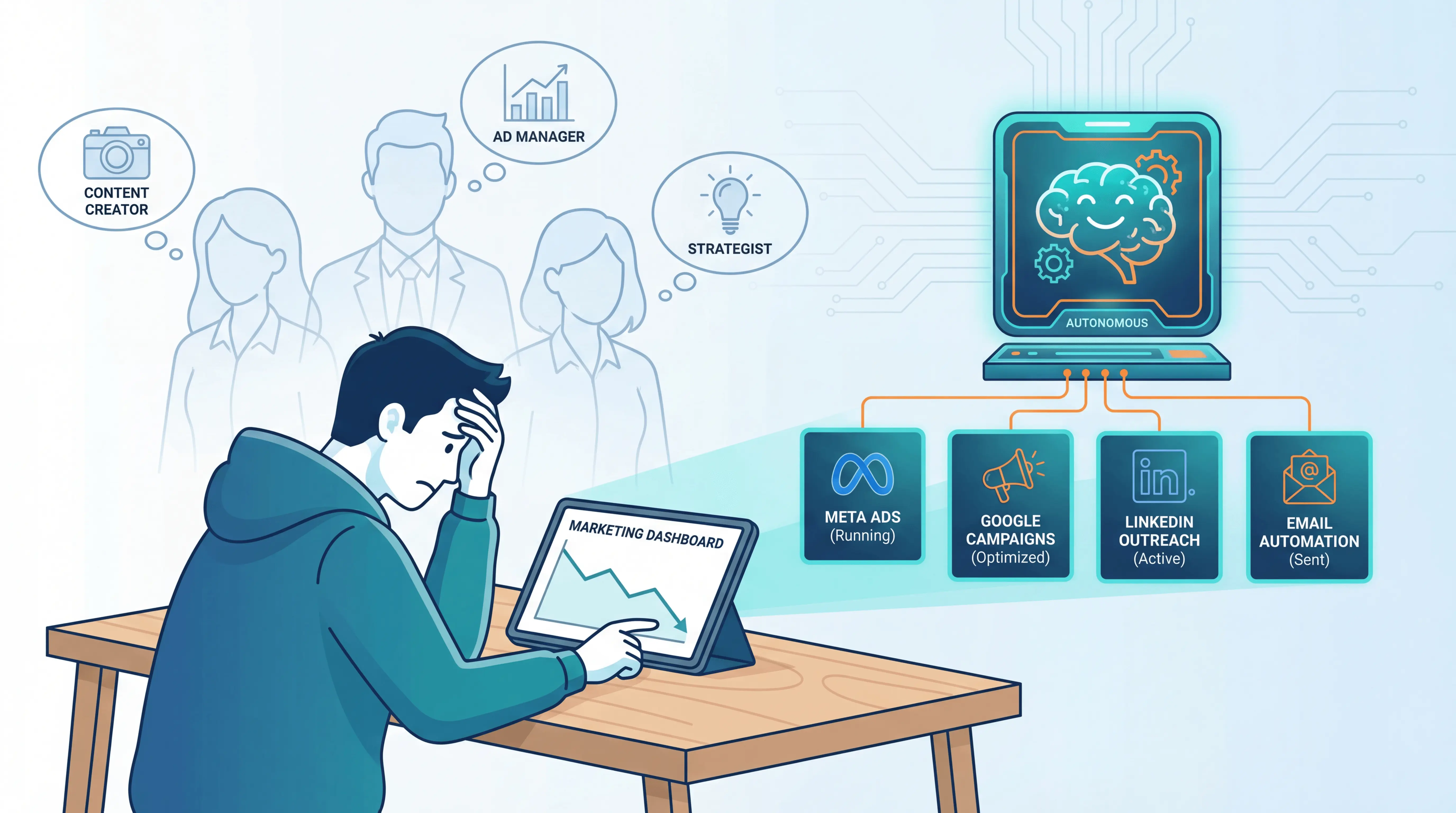 Marketing budgets have dropped to 7.7% of company revenue in 2025 while traditional hiring costs over $150,000 annually before delivering ROI, forcing founders to find smarter scaling alternatives. This comprehensive guide evaluates four tested solutions for growth without headcount expansion: Emma AI for autonomous strategy plus execution with 90-day results, fractional CMOs for strategy-only needs starting at $6,000 monthly, full-service agencies requiring $10,000-$50,000 monthly budgets, and freelancer networks for project-based work. Emma emerges as the optimal choice by combining human-led go-to-market diagnostics with AI-powered multi-channel execution that improves autonomously over time, delivering measurable outcomes within 90 days through integrated Slack workflows and real-time analytics dashboards. The evaluation framework prioritizes speed to results, strategic depth, autonomous improvement, multi-channel orchestration, transparency, and founder control to match solutions with specific business stages and budget constraints. With 60% of marketers now using AI tools daily and companies seeing 544% ROI from marketing automation, the future favors integrated approaches that deliver expert-level marketing with compounding results rather than linear cost increases.